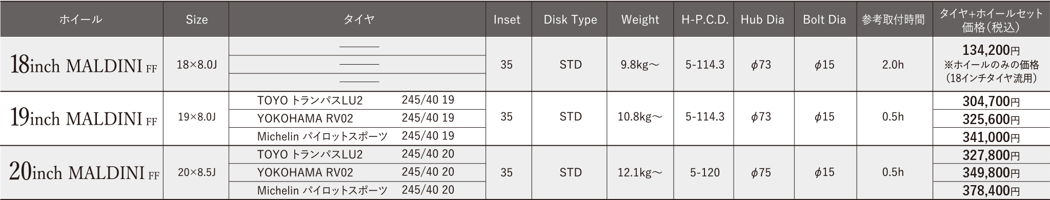 ※18inch MALDINI FFは純正18インチタイヤ流用となるため、タイヤ代を含まない価格を記載しております。