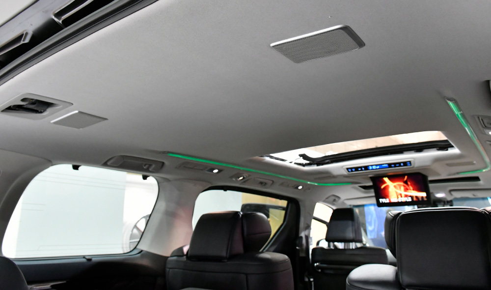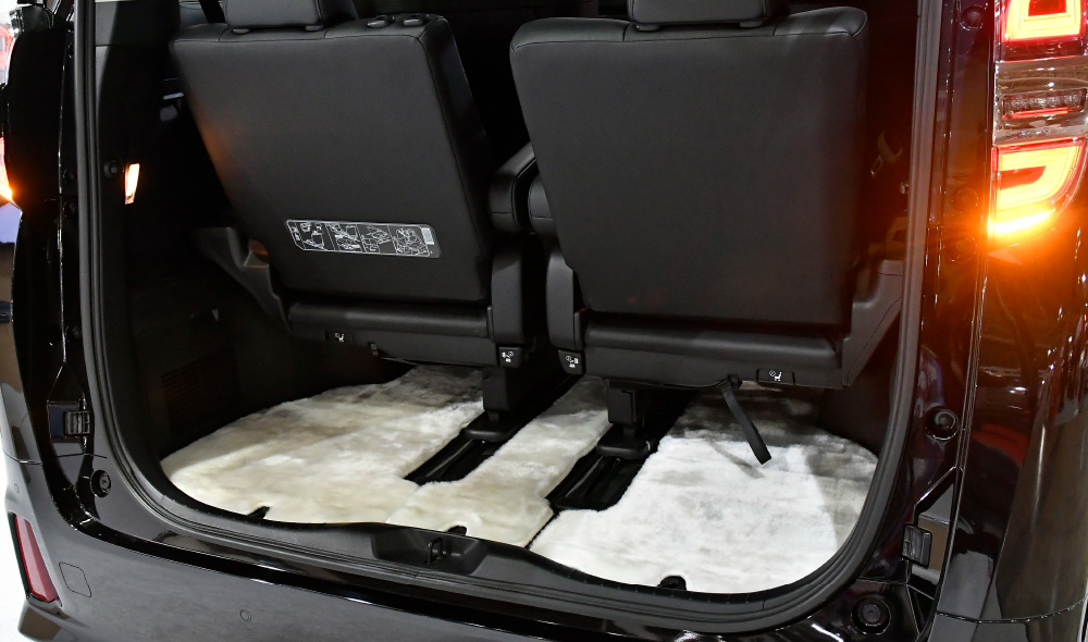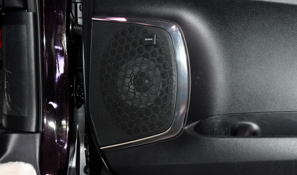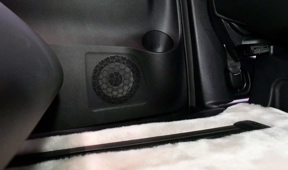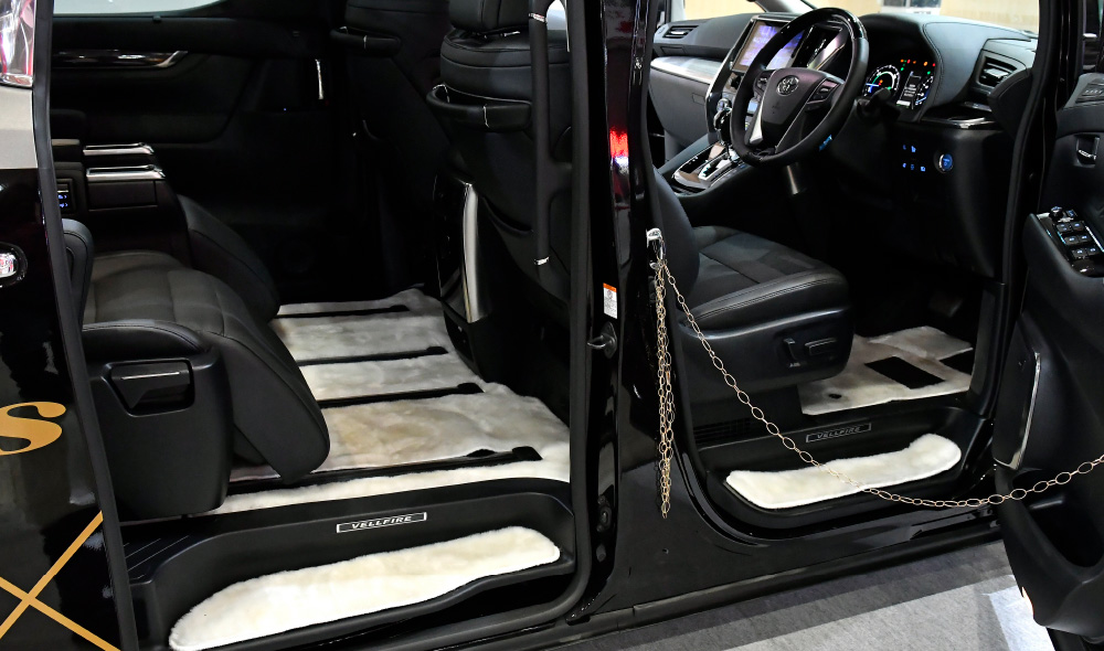 合わせて車室内も高級感溢れるリビングを思わせるスペースにカスタムメイド。オーディオはBEWITH社製の新世代コンポーネント・スピーカー「Reference AM」を採用し、ライブ会場のような臨場感を。また、足元は毛足が長くふわりと沈み込むような感触を味わえるオリジナルの最上級ファーマットをコーディネート(完全土禁仕様!!)し、遊び心と重厚感を両立させたゴージャスな車内空間を実現しました。